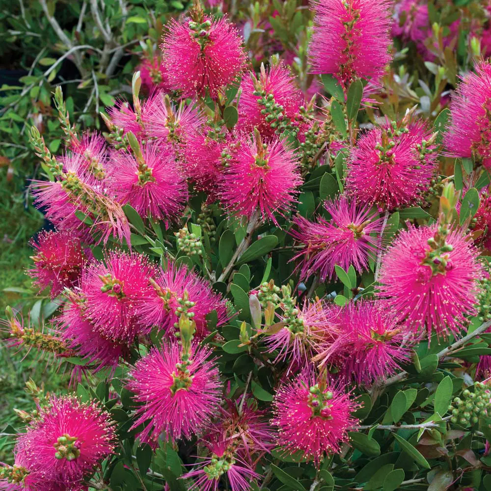 Callistemon Hot Pink is an attractive variety of the commonly known, Bottlebrush, and is renowned for its flowers. Bright pink flowers are produced from spring through autumn and literally transform the plant into a mass of colour. The olive-green leaves serve as a pleasant backdrop to the flowers as it grows to about 1.4 m tall and 1 m wide. Callistemon Hot Pink is commonly added to a mixed planting, planted around outdoor living areas, mass planted on a bank, or planted to provide vibrant colour.