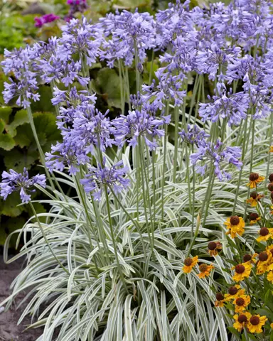 Agapanthus Bertsbrook is an herbaceous perennial that produces beautiful, mid-blue flowers throughout summer. The petals have a darker band creating a two-toned appearance. Flowers rise above dark green foliage as it grows to 20 cm tall and 30 cm wide. Commonly used in borders, mass plantings, cottage gardens, or containers.
