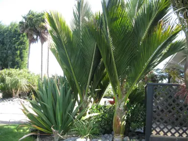 Archontophoenix cunninghamiana, commonly known as the King Palm, is a tall and slender Palm Tree from Australia. It carries long, elegant, glossy, dark green fronds, and will rapidly reach 12 m tall and 5 m wide. Archontophoenix cunninghamiana is commonly featured in tropical gardens, used in avenue plantings, incorporated into mixed plantings, grown as a specimen, used to border an entranceway, or planted in clusters for an impressive display.