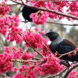 Prunus campanulata superba with pink flowers and a tui in the tree.