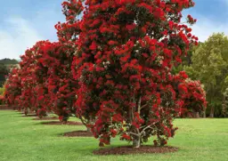 A large Metrosideros 'Maori Princess' trees in an avenue with masses of red flowers.