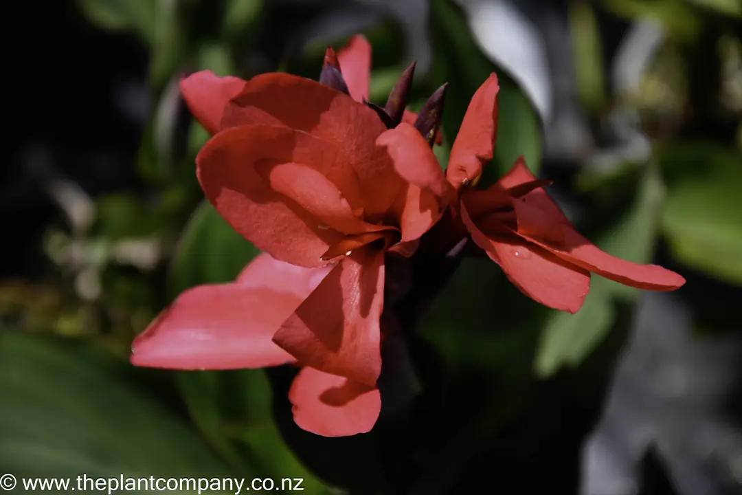 Canna 'Australia' is a striking perennial admired for its deep bronze foliage and vibrant red flowers that create bold contrast in New Zealand...