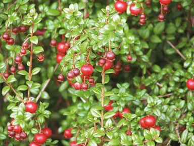 Cranberry Sungold carries pale pink-white flowers in spring which are followed by 1-2 cm diameter fruits in autumn. The fruit on this cranberry bush are medium red in colour and have a pleasant flavour. The plant itself grows as a trailing, evergreen with leaves that are variegated with yellow and green. It usually reaches 25 cm tall and will spread 1.5 m wide. Cranberry Sungold is commonly used as a groundcover, maintained in a container, or planted specifically for fruit production.