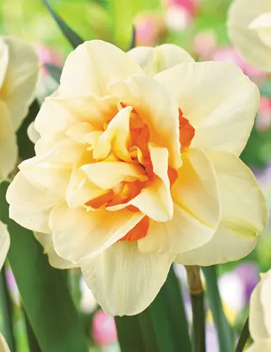 “Flower Parade” is a stunning variety of Daffodil that features cream-coloured flowers with a ruffled, apricot-orange centre. The showy blooms are borne on sturdy stems through late spring above the lush, grass-like foliage. The combination of flowers and dark green leaves is impressive and lets you know spring has arrived. This perennial plant typically grows to 40 cm tall and 20 cm wide, performing best when positioned in full sun on a well-drained site. It is tolerant of short periods of dry, frost, cool climates, and will die back during these times to regrow when conditions start to warm. “Flower Parade” is commonly included in cottage gardens, planted around outdoor living areas, used in border plantings, planted around the base of deciduous trees and shrubs, or maintained in a container. A mass planting is a must with this variety with bulbs spaced 15 cm apart and planted 8-10 cm deep.
