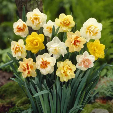 This mix of our favoured Daffodil varieties with double flowers has been selected to give a good spread of flowering. The showy blooms are borne on sturdy stems through spring above the lush, grass-like foliage. The combination of flowers and dark green leaves is impressive and lets you know spring has arrived. This perennial plant typically grows to 40 cm tall and 20 cm wide, performing best when positioned in full sun on a well-drained site. It is tolerant of short periods of dry, frost, cool climates, and will die back during these times to regrow when conditions start to warm. This mix is commonly included in cottage gardens, planted around outdoor living areas, used in border plantings, planted around the base of deciduous trees and shrubs, or maintained in a container. A mass planting is a must with bulbs spaced 15 cm apart and planted 8-10 cm deep.