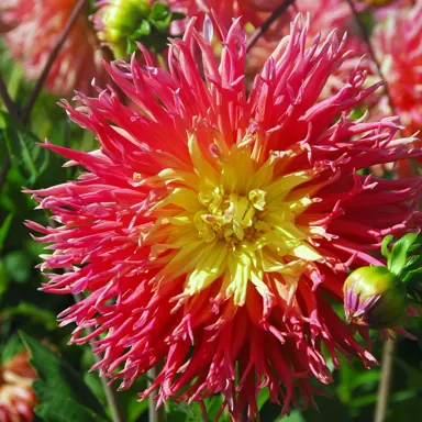 Dahlia Fringed Star is a beautiful and award-winning variety of Dahlia owing to its colourful and interesting flowers. This herbaceous perennial produces large and showy, cactus-like, peach-pink flowers with a butter yellow centre from summer through autumn. They are held above the lush and dense, dark green foliage as it grows to 1.1 m tall and 70 cm wide. Dahlia Fringed Star is ideal for cottage gardens, border planting, adding to a mixed planting, or growing anywhere you want stunning flowers.