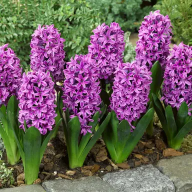 “Miss Saigon” is a stunning variety of Hyacinth that features rich purple-pink flowers. The showy and fragrant blooms are borne off a sturdy stem that can rise to 25 cm tall during mid-spring. The flowers are complemented with dark green foliage. This perennial typically grows to 15 cm tall and 10-15 cm wide, performing best when positioned in full sun on a well-drained site. It is tolerant of short periods of dry, frost, cool climates, and will die back during these times to regrow when conditions start to warm. “Miss Saigon” is commonly included in cottage gardens, planted around outdoor living areas, used in border plantings, or maintained in a container and brought indoors. A mass planting is a must with this variety with bulbs spaced 10 cm apart and planted 8-10 cm deep.