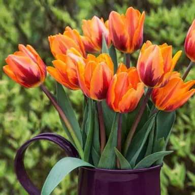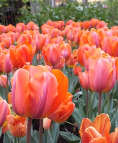 “Princess Irene” is a variety of Tulip that features stunning flowers that are orange with a purple flame. The showy blooms are borne on sturdy stems from mid-spring above the lush foliage. This perennial typically grows to 40 cm tall and 25 cm wide, performing best when positioned in full sun on a well-drained site. It is tolerant of short periods of dry, frost, cool climates, and will die back during these times to regrow when conditions start to warm. “Princess Irene” is commonly included in cottage gardens, planted around outdoor living areas, used in border plantings, planted around the base of deciduous trees and shrubs, or maintained in a container. A mass planting is a must with this variety with bulbs spaced 15-20 cm apart and planted 8-10 cm deep.