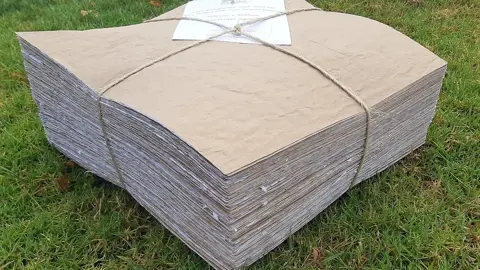 Earthmat Squares are made from recycled paper and designed to last 1-2 years before breaking down completely to become part of the soil. The squares will, however, last 6-12 months if covered with green mulch or left exposed to the elements. Better longevity is achieved when bark or stones are applied overtop. The outer layers are brown, Kraft paper and the middle layer is shredded paper. The paper is glued together using corn starch which would otherwise end up in a landfill. The starch binds it strongly and gives the mat longevity. The result is a mat that is 500 gsm and made from 84% recycled products. Please note: the squares can be prone to tear if it becomes wet or is not laid on an even surface during laying. It should be laid onto pre-moistened soil, pinned down using Earthmat Biodegradable Pins, then covered with bark or other mulch. The Plant Company recommends this product both from a weed control and environmental perspective.