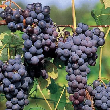 Grape Buffalo is a variety of eating grape that produces fruit that ripen in early autumn. It features large sized, juicy, dark blue-black berries that have a lovely taste. Birds love the fruit and will come from far and wide to feast if they are not protected. It grows as a deciduous vine, carrying lush, mid-green leaves which develop yellow tones in autumn before falling. Grape Buffalo is commonly trained onto a fence or trellis for fruit production or as an attractive climber.
