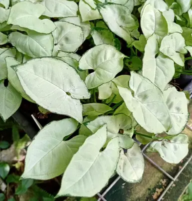 A Syngonium 'Silver Pearl' plant with lush, light green leaves growing in a pot.