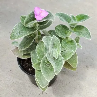 Tradescantia sillamontana is a popular houseplant owing to its interest foliage and flowers. It hosts green foliage with a velvet covering that is soft to touch. The leaves are held off upright stems and become adorned with pink flowers during summer. This herbaceous perennial typically grows to 30 cm tall and 50 cm wide, performing best when positioned in full sun or partial shade with a well-drained soil, and protected from cold and drafts. This Tradescantia is perfect for growing indoors or for planting around protected outdoor living areas.