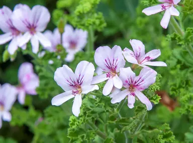 Pelargonium crispum is a variety of Geranium grown for its interesting foliage and clusters of light pink flowers. The leaves on this evergreen shrub are bright green and have a crinkled edge. The stems are soft and coated in green, glandular hairs which release a lemon scent when brushed against. It typically grows to 75 cm tall and 1.5 m wide. Pelargonium crispum is ideal for adding to mixed and border plantings, growing as a groundcover, or planting around outdoor living areas. The leaves are often dried and used in potpourri.