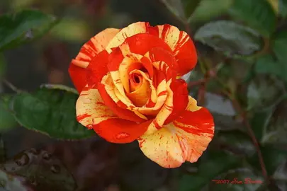 The 'Oranges and Lemons' standard rose is a Floribunda variety that features masses of showy flowers with yellow and orange stripes. The impressive blooms emerge in spring and continue until autumn. The foliage comprises small, dark green leaves, which provide a lovely backdrop to the flowers. The 'Oranges and Lemons' standard rose is commonly included in a mixed planting, in cottage, courtyard, or formal gardens, planted to border an entrance, or included anywhere the beauty can be appreciated.
