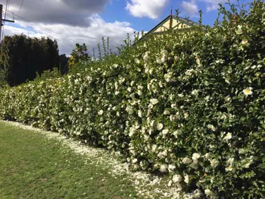 Camellia 'Asakura' produces exquisite, pure white flowers during spring and autumn. These spectacular blooms are contrasted wonderfully with glossy, dark green foliage as it grows to 2.5 m tall and 1.5 m wide. Camellia 'Asakura' is commonly grown as a specimen, clipped into a hedge, added to a mixed planting, used in cottage and “white” gardens, planted around outdoor living areas, or used as a backdrop for smaller plants.