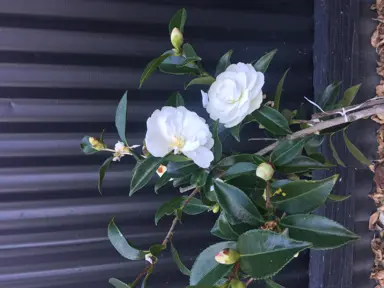 Camellia Early Pearly is a very popular, evergreen shrub that flowers from late autumn through winter. It produces showy, mildly fragrant, semi-double, pure white blooms, contrasting nicely with the glossy, dark green foliage as it grows to about 2 m tall and 1.5 m wide. Camellia Early Pearly is commonly grown as a specimen, clipped into a hedge, added to a mixed planting, used in cottage or 'white' gardens, planted around outdoor living areas, or used as a backdrop for smaller plants.
