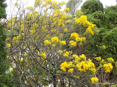 Sophora molloyi 'Dragons Gold' small trees in full flower at The Plant Company.