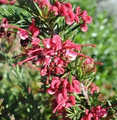 Grevillea Tuckers Dwarf is a beautiful, evergreen shrub with lush, green foliage and colourful flowers. The foliage is adorned during winter and spring with masses of delicate, pink and cream, spider-like flowers. These eye-catching flowers are complemented with finely textured, dark green foliage as it grows to 60 cm tall and the same wide. Grevillea Tuckers Dwarf is commonly included in mixed plantings, added to coastal gardens, planted to attract birds, added to borders, or grown as a low hedge.
