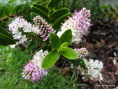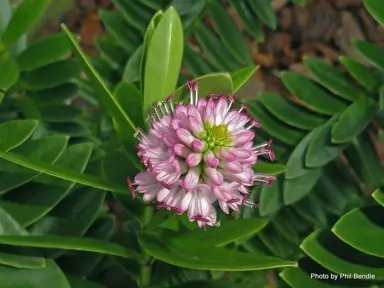 Hebe 'Oratia Beauty' is a hardy, evergreen shrub that grows to about 75 cm tall and 1 m wide. The leaves on this NZ native are dark green and held densely on short stems. The foliage is complemented through summer with masses of showy clusters made up of pink and white flowers. Hebe 'Oratia Beauty' is an excellent plant for border planting, adding to mixed plantings, or incorporating into a rock garden, and is also suitable for mass planting to create an impressive display.