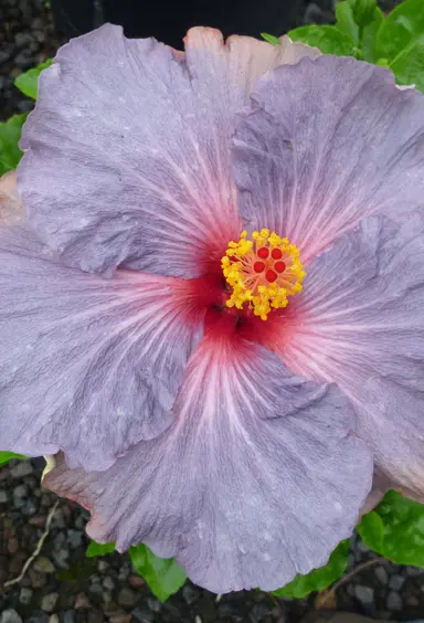 Hibiscus Blue Thunder is grown for its showy, single flowers. The flowers are a pale mauve-pink with a cherry red centre, and have a papery appearance. They are produced through summer and autumn and are held on upright, slender branches as it grows to 1.5 m tall and the same wide. Hibiscus Blue Thunder is commonly grown as a showy specimen, used as an informal hedge, planted for screening, included in a mixed planting, added to a tropical garden, or planted around outdoor living areas.