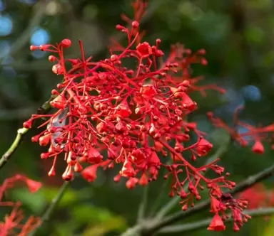 Brachychiton acerifolius, known as the Illawara Flame Tree, is grown for its unusual flowering. It sheds deep green leaves in spring and produces masses of scarlet flowers on a near nude tree. Growing compactly with a pyramidal shape to about 12 m tall and 8 m wide, it makes a magnificent specimen in large gardens or parks.