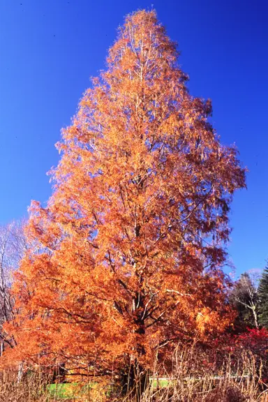 Metasequoia glyptostroboides, commonly known as the Dawn Redwood, is a deciduous tree that features fine, needle like, rich-green leaves which turn colourful shades of pink, gold, and red-brown in autumn before falling. This stately tree grows with a narrow and conical shape to about 30 m tall and 8 m wide. Metasequoia glyptostroboides is commonly grown as a specimen, grown for timber, used to help with erosion control, planted for shelter, or grown around large water features such as ponds and lakes.