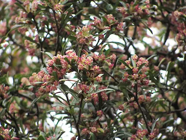 Pittosporum turneri is a rare, NZ native tree that grows to about 8 m tall and 1.5 m wide. It has a columnar growth habit with branches tending to be more prominent than the leaves on this plant. Red-pink flowers with a light scent adorn the tree during spring. Pittosporum turneri makes a spectacular backdrop for smaller, leafier plants. It also looks great when planted in an avenue or against a plain wall, and it can be trimmed as necessary.